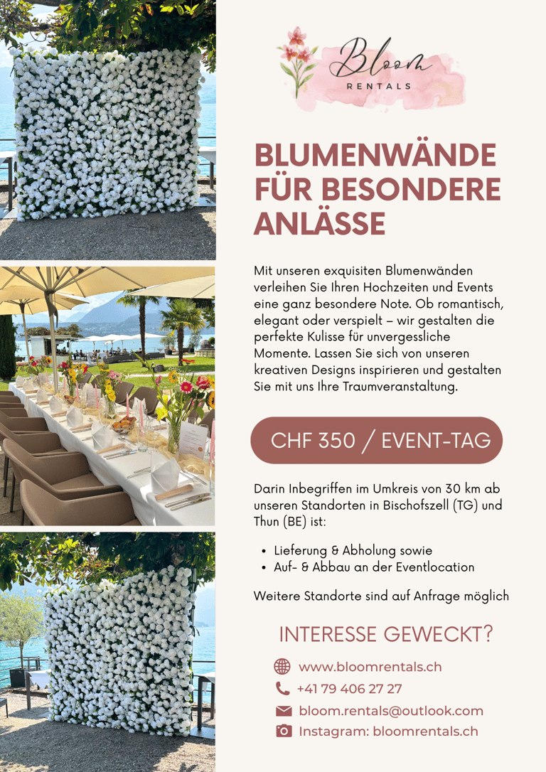 Die Blumenwände von Bloomrentals haben unsere Hochzeit unvergesslich gemacht! Die Wand war grösser als gedacht und Schneeweiss, der Service war auch sehr angenhemen. Gerne wieder, Sehr empfehlenswert!